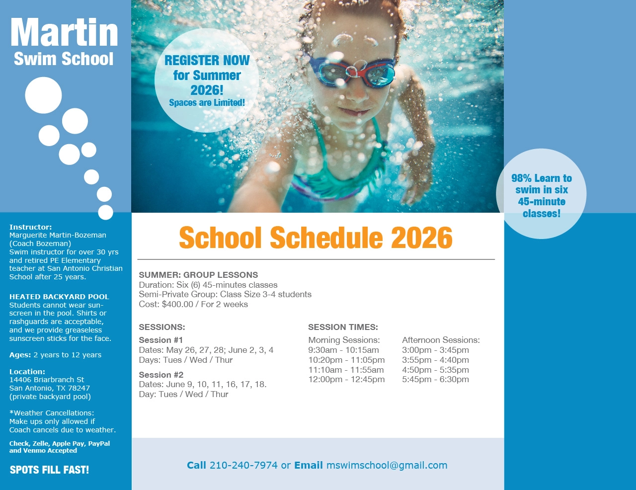 Click Here to Download the Registration FormFor More Information: Call: (210) 240-7974 Email: mswimschool@gmail.com